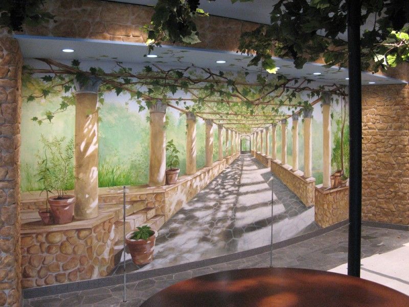 Im Bauch des Clubschiffes eröffnet sich dem Betrachter dank unserer versierten Kunst- und Illusionsmaler nun der Eindruck weitläufiger Parkanlagen und täuschend echter Scheinarchitektur. Das Gefühl großzügiger und edler Raumansichten macht nicht nur den ganz speziellen Zauber illusionistischer Malerei aus, sondern versieht das Innere des Kreuzfahrtschiffes darüber hinaus mit einer Aura von Luftigkeit.