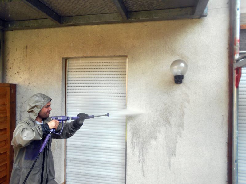 Verputzte und gestrichene Fassadenflächen wurden mittels Dampfstrahlgerät gereinigt. Gegen Algen- und Moosbildung wurde KEIM Algicid aufgetragen. Putzausbesserungen und kleinere Verputzarbeiten erfolgten mit artgleichem Material.