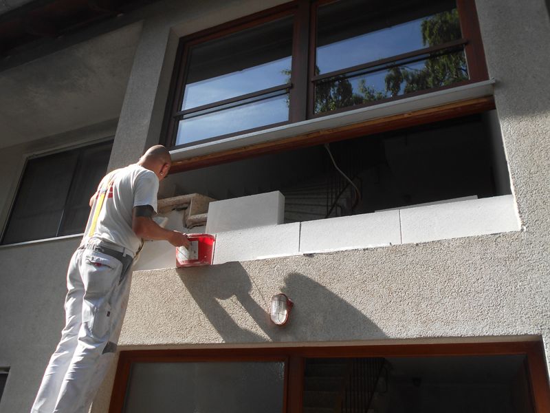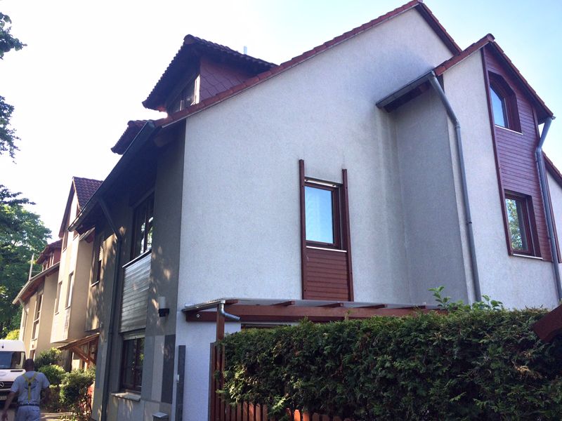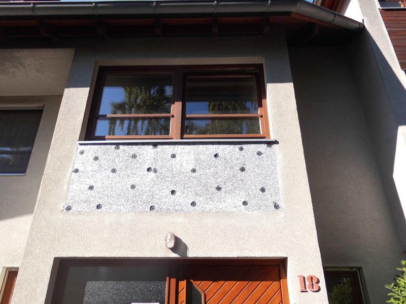 Fassadenholzverkleidungen wurden zurückgebaut und entfernt. Als Ausgleich wurden Polystyrol-Hartschaumdämmplatten mit WDVS-Dübeln angebracht. Anschließend folgte die vollflächige Überspachtelung mit mineralischem Kleber, in den Armierungsgewebe eingebettet wurde.[nbsp] Am Übergang zwischen neuer Dämmung und Altputz wurde eine Schattenfuge ausgebildet. Zur Vorbehandlung des Unterputzes wurde ein Putzgrund aufgebracht, bevor der mineralische Oberputz aufgetragen wurde.