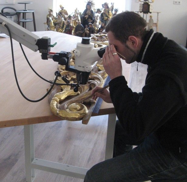 Für die Restaurierung von Ausstattungsgegenständen wie Figuren, Gemälden oder Altären stehen uns weitläufige, speziell gesicherte und klimatisierte Atelierräume zur Verfügung. Tageslichtlampen, Mikroskope und Großflächen-UV-Leuchten schaffen bestmögliche Arbeitsbedingungen für die Restaurierung historischer Kunstwerke.